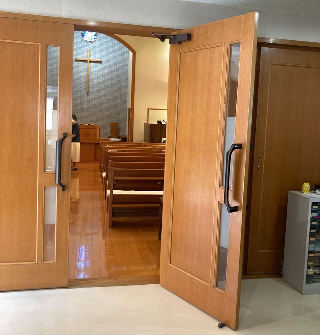 この扉の向こうが礼拝堂です。1階にあります。